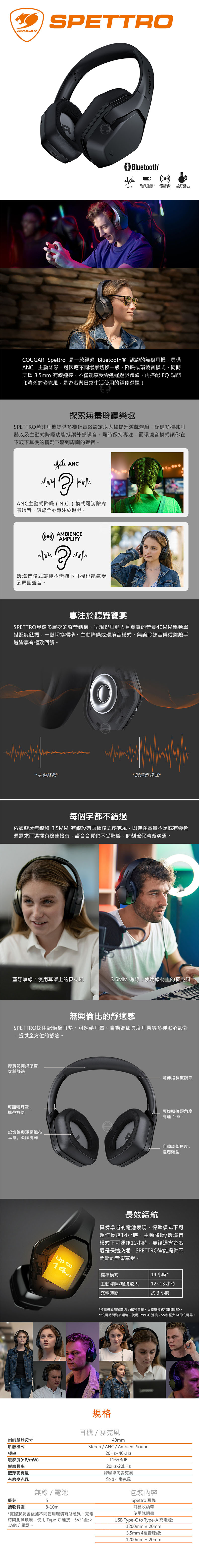 COUGAR Spettro 是一款經過 Bluetooth® 認證的無線耳機,具備 ANC 主動降噪,可因應不同場景切換一般、降噪或環境音模式。同時支援 3.5mm 有線連接,不僅能享受零延遲遊戲體驗,再搭配 EQ 調節和清晰的麥克風,是遊戲與日常生活使用的絕佳選擇!
