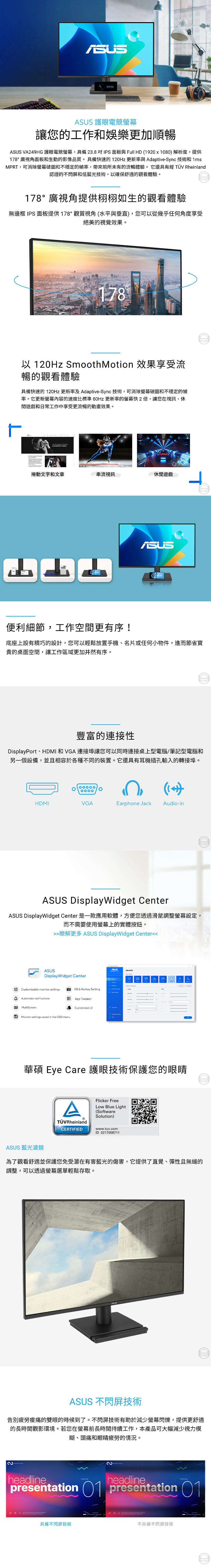 ASUS VA249HG 護眼電競螢幕,具備 23.8 吋 IPS 面板與 Full HD (1920 x 1080) 解析度,提供 178° 廣視角面板和生動的影像品質。 具備快速的 120Hz 更新率與 Adaptive-Sync 技術和 1ms MPRT,可消除螢幕破圖和不穩定的幀率,帶來前所未有的流暢體驗。 它還具有經 TÜV Rheinland 認證的不閃屏和低藍光技術,以確保舒適的觀看體驗。