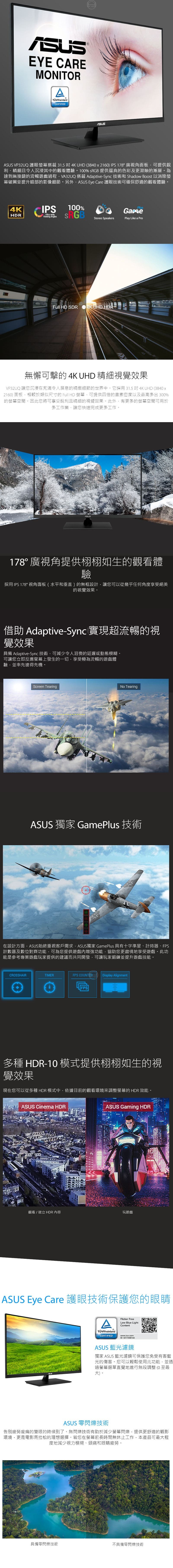 ASUS VP32UQ 護眼螢幕搭載 31.5 吋 4K UHD (3840 x 2160) IPS 178° 廣視角面板,可提供銳利、精細且令人沉浸其中的觀看體驗。100% sRGB 提供逼真的色彩及更滑順的漸層。為達到無接縫的流暢遊戲過程,VA32UQ 搭載 Adaptive-Sync 技術和 Shadow Boost 以消除螢幕破圖並提升暗部的影像細節。另外,ASUS Eye Care 護眼技術可確保舒適的觀看體驗。