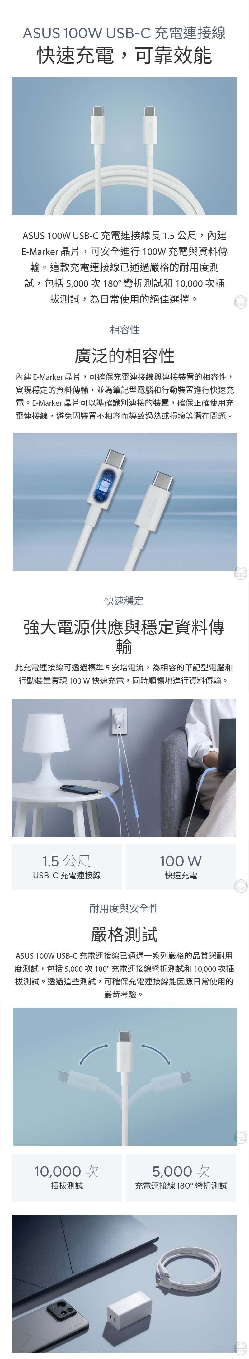 3.此充電連接線可透過標準 5 安培電流,為相容的筆記型電腦和行動裝置實現 100 W 快速充電。