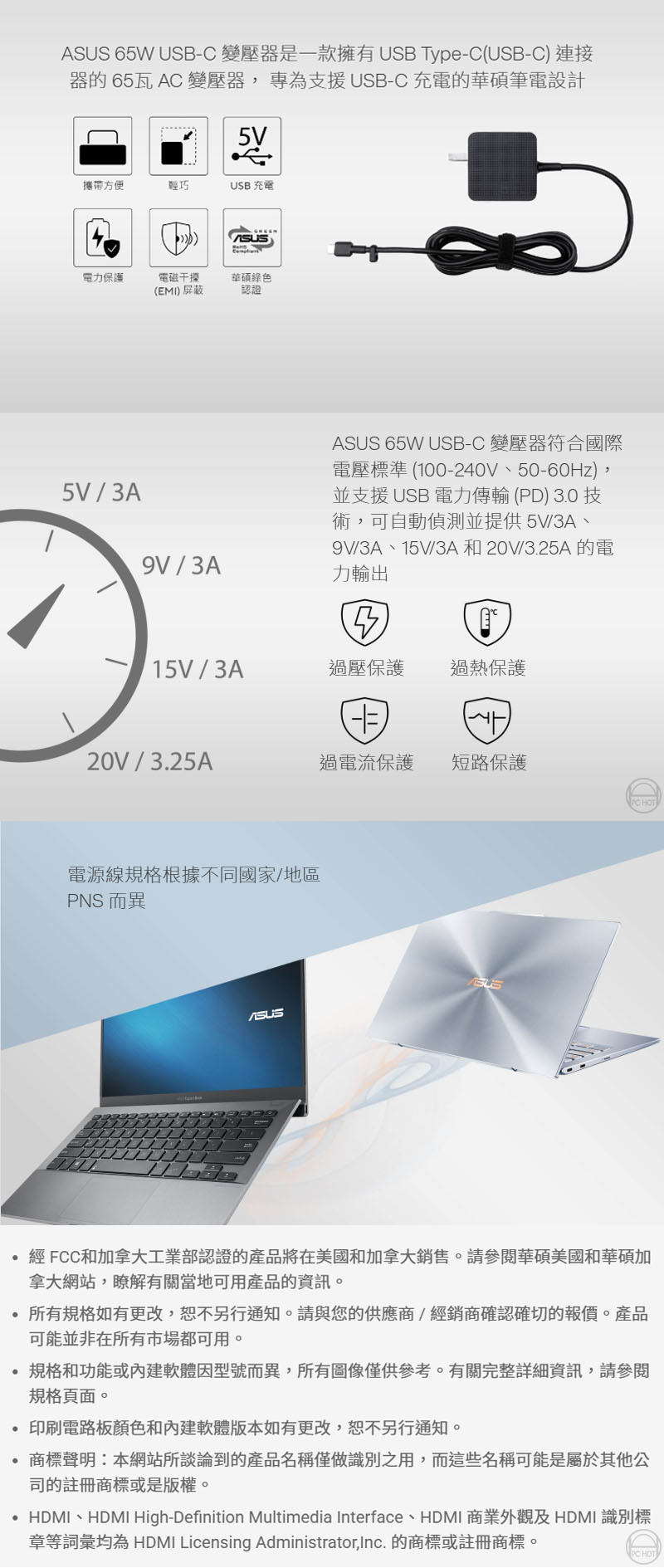 2.採用 USB PD3.0 技術的 USB Type-C 連接器,能夠自動偵測並提供 5V/3A、9V/3A、15V/3A 及 20V/3.25A 的輸出。