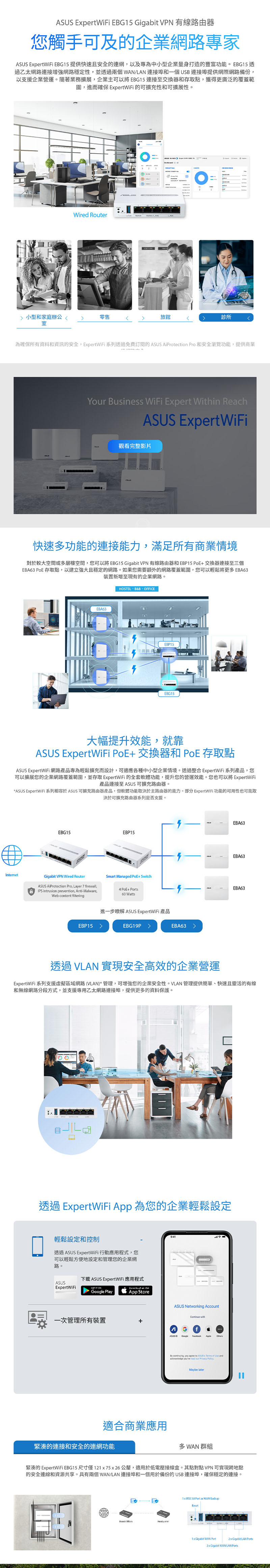 ▶️產品規格型號:ASUS ExpertWiFi EBG15Model Name:EBG15Network Standard:IEEE 802.1pIEEE 802.1qIEEE 802.3IEEE 802.3abIEEE 802.3iIEEE 802.3uIEEE 802.3xIPv4IPv6Antenna:Internal Bluetooth antenna x 1Processor:1.8GHz Dual-core ARMv8Memory:256 MB Flash512 MB RAMOperating Mode:AiMesh Node ModeI/O Ports:Gigabit WAN Port x 1Gigabit LAN Port x 4 (Changable WAN/LAN Port x 2)USB 3.2 Gen 1 x 1Buttons:Reset ButtonLED Indicator:Power x 1USB x 1Power Supply:AC Input : 110V~240V (50~60Hz)DC Output : 12 V with max. 1.5 A currentPackage Content:ExpertWiFi EBG15RJ-45 cablePower adapterWarranty cardQuick start guideProduct Weight (g):250gProduct Dimentions:121x75x26 mmRemark:Content and color may vary in different regions and packages.AiMesh:AiMesh• Primary AiMesh Router• AiMesh NodeDevice Access Control:"Allow you to block access to unwanted websites and apps."Web & Apps FiltersTime SchedulingSafe BrowsingCustomized Internet Schedule• Maximum Device Access Control Profile :12• Maximum Device Access Control Content Filter Rule :12Dashboard:DashboardSelf-Defined Network:"You can create additional networks for different purposes, these networks are separate from the main network domain, to provide enhanced security, and create comprehensive network environment with customized settings."• Employee• Guest Portal• Guest Network• Scheduled Network• IoT Network• VPN Network• Maximum Self-Defined Network Rule :16VLANBandwidth LimiterAP isolateDNS Server ConnectionSecurity:AiProtectionVPNLet's EncryptDNS-over-TLSSSHFirewall• Maximum Firewall Keyword Filter :64• Maximum Firewall Network Service Filter :32• Maximum Firewall URL Filter : 64AiProtection:AiProtection Pro• Router Security Assessment• Malicious Site Blocking• Two-Way IPS• Infected Device Prevention and BlockingVPN:VPN Client L2PTVPN Client Open VPNVPN Client PPTPVPN Client WireGuardVPN Server IPSecVPN Server Open VPNVPN Server PPTPVPN Server WireGuardVPN FusionSupport SurfsharkTraffic Control:Adaptive QoS• Bandwidth Monitor• Bandwidth LimiterTraditional QoSTraffic Monitor• Real-time Traffic Monitor• Wired Traffic MonitorTraffic Analyzer• Website HistoryWAN:Internet Connection Type• PPPoE• PPTP• L2TP• Automatic IP• Static IP• IPSecDual WANMulti WAN GroupWAN Aggregation3G / 4G LTE Dongle4G / 5G Auto Mobile TetheringPort Forwarding• Maximum Port Forwarding Rule : 64Port Triggering• Maximum Port Triggering Rule : 32DMZDDNSNAT Passthrough• PPTP Pass-Through• L2TP Pass-Through• IPSec Pass-Through• RTSP Pass-Through• H.323 Pass-Through• PPPoE RelayLAN:DHCP ServerIGMP SnoopingIPTVLAN Link AggregationManually Assign IP AddressWake on LAN (WOL)VLANUSB application:4G / 5G Auto Mobile TetheringSafely Remove DiskMedia ServerSamba ServerFTP ServerShared Folder PrivilegesUser Interface:WEB: ASUSWRTAPP: ASUS ExpertWiFi APPManagement:Multiple Site ManagementAdministration:Configuration Backup and RestoreDiagnosis ToolsFeedback SystemSystem LogNew Device Connect NotificationLogin CaptchaConnection DiagnosisAuto Firmware Update