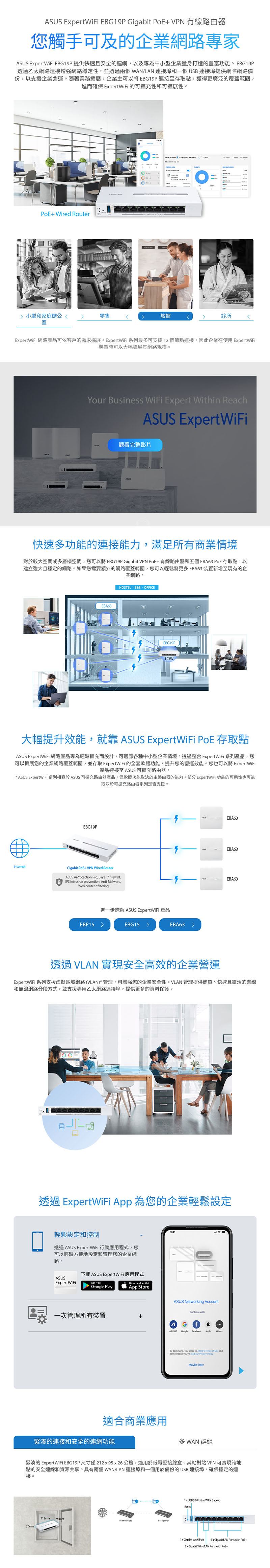ASUS ExpertWiFi EBG19P 提供快速且安全的連網,以及專為中小型企業量身打造的豐富功能。 EBG19P 透過乙太網路連接增強網路穩定性,並透過兩個 WAN/LAN 連接埠和一個 USB 連接埠提供網際網路備份,以支援企業營運。隨著業務擴展,企業主可以將 EBG19P 連接至存取點,獲得更廣泛的覆蓋範圍,進而確保 ExpertWiFi 的可擴充性和可擴展性。