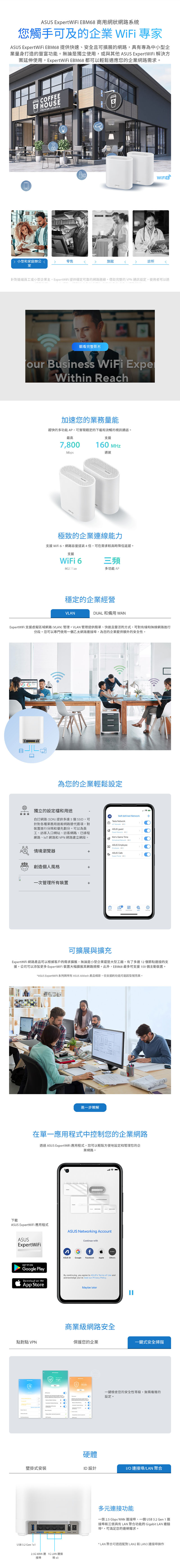 ASUS ExpertWiFi EBM68 提供快速、安全且可擴展的網路,具有專為中小型企業量身打造的豐富功能。無論是獨立使用,或與其他 ASUS ExpertWiFi 解決方案延伸使用,ExpertWiFi EBM68 都可以輕鬆適應您的企業網路需求。
