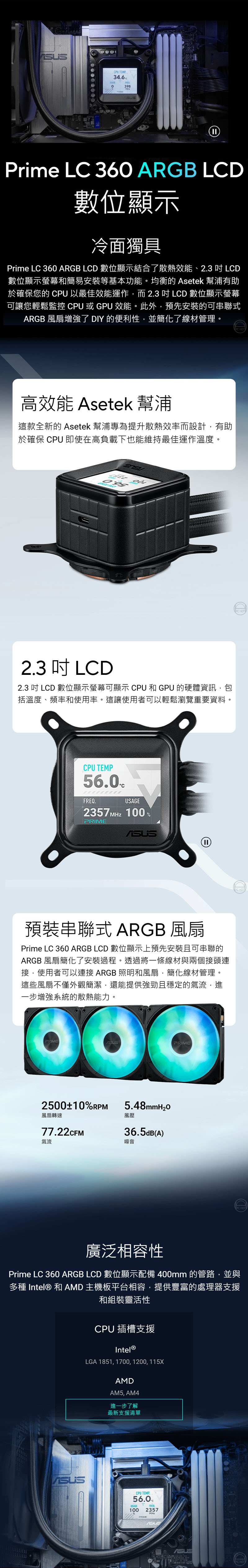 Prime LC 360 ARGB LCD 數位顯示配備 400mm 的管路,並與多種 Intel® 和 AMD 主機板平台相容,提供豐富的處理器支援和組裝靈活性。