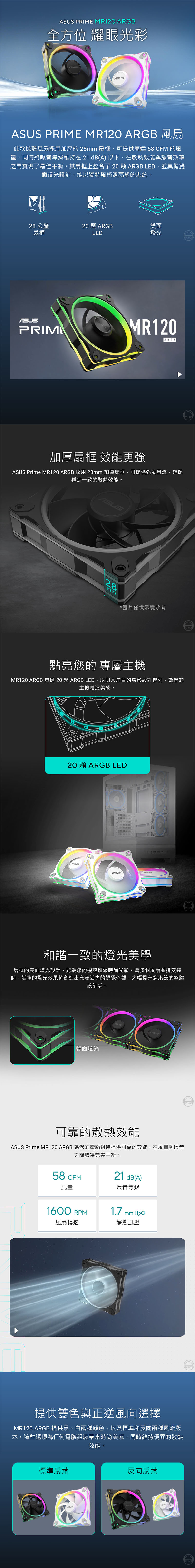 ASUS 華碩 Prime MR120 ARGB 機殼風扇 單入組 三入組 白色 反向 加厚扇框 雙側框架燈效 風扇 電腦風扇