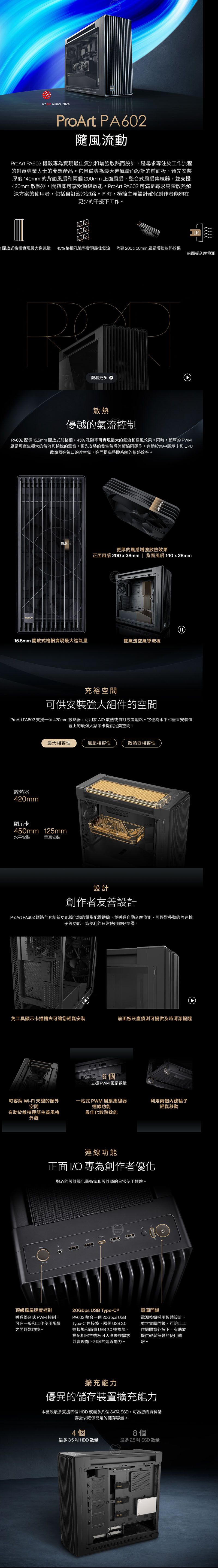ProArt PA602 機殼專為實現最佳氣流和增強散熱而設計,是尋求專注於工作流程的創意專業人士的夢想產品。它具備專為最大進氣量而設計的前面板、預先安裝厚度 140mm 的背面風扇和兩個 200mm 正面風扇、整合式風扇集線器,並支援 420mm 散熱器,開箱即可享受頂級效能。ProArt PA602 可滿足尋求高階散熱解決方案的使用者,包括自訂液冷迴路。同時,極簡主義設計確保創作者能夠在更少的干擾下工作。