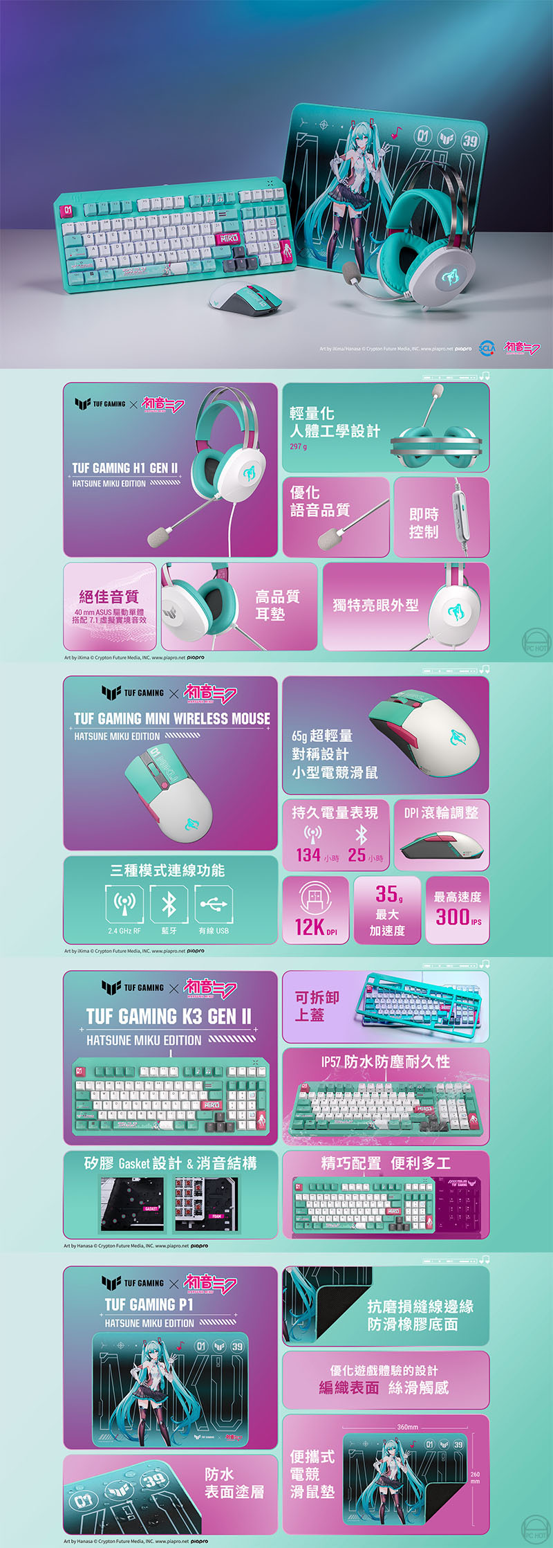 ASUS 與 Crypton Future Media 攜手合作,推出 TUFGaming x 初音未來 聯名系列,為遊戲世界注入賽博風格的嶄新能量。首波產品陣容包括耳機、鍵盤、滑鼠與滑鼠墊,融合TUF Gaming 的機械裝甲美學與初音標誌性的青綠與粉紅配色。這款特別版系列結合了TUF 經典設計與初音活潑俏皮的精神,讓玩家與粉絲能夠打造充滿未來感的遊戲周邊配置。