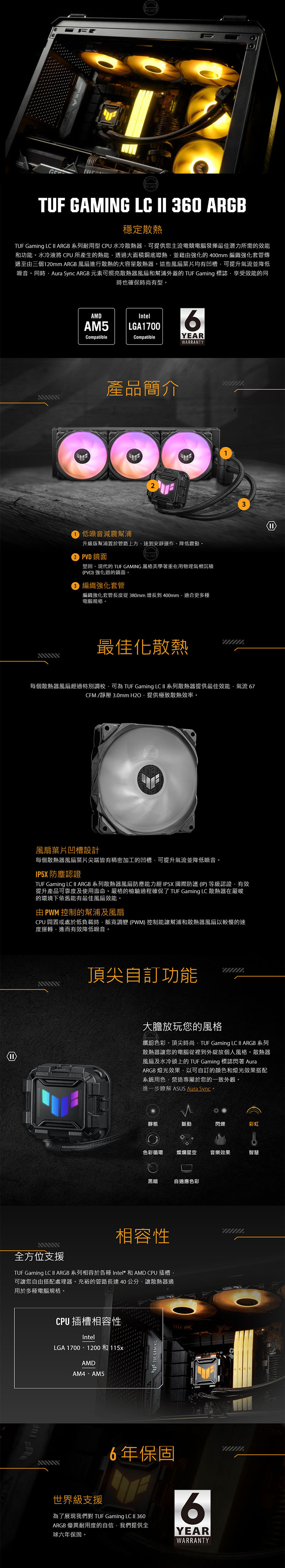 為了展現我們對 TUF Gaming LC II 340 ARGB 優異耐用度的自信,我們提供全球六年保固。