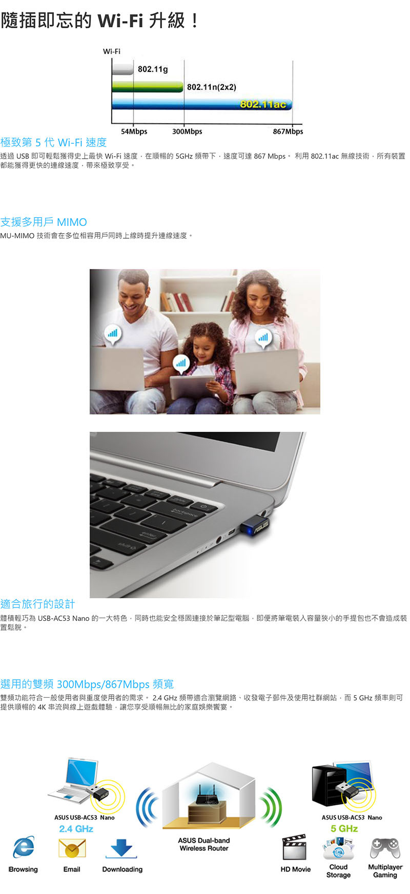 透過 USB 即可輕鬆獲得史上最快 Wi-Fi 速度,在順暢的 5GHz 頻帶下,速度可達 867 Mbps。 利用 802.11ac 無線技術,所有裝置都能獲得更快的連線速度,帶來極致享受。