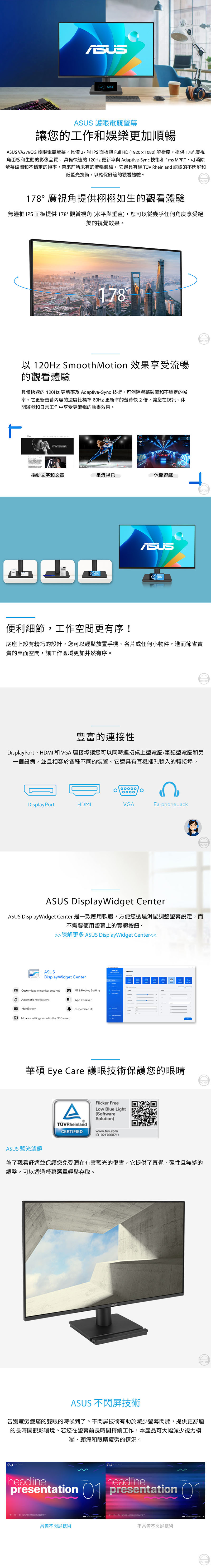 ASUS VA279QG 護眼電競螢幕,具備 27 吋 IPS 面板與 Full HD (1920 x 1080) 解析度,提供 178° 廣視角面板和生動的影像品質。 具備快速的 120Hz 更新率與 Adaptive-Sync 技術和 1ms MPRT,可消除螢幕破圖和不穩定的幀率,帶來前所未有的流暢體驗。 它還具有經 TÜV Rheinland 認證的不閃屏和低藍光技術,以確保舒適的觀看體驗。