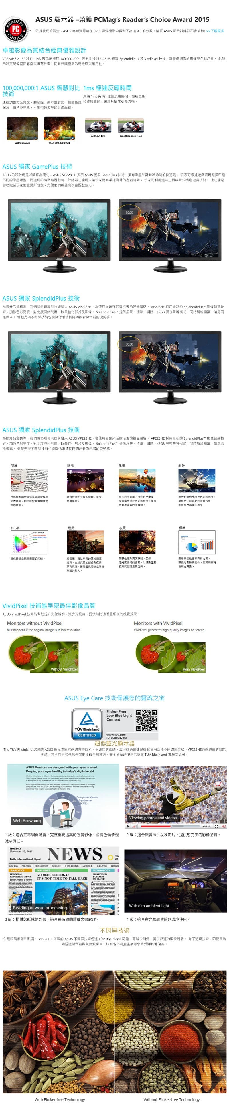 為提升品質標準,我們將多項專利技術融入 ASUS VP228HE,為使用者帶來活靈活現的視覺體驗。 VP228HE 採用全新的 SplendidPlus™ 影像智慧技術,加強色彩亮度、對比度與銳利度,以最佳化影片及影像。 SplendidPlus™ 提供風景、標準、劇院、sRGB 與夜景等模式,同時新增閱讀、暗房兩種模式。 低藍光與不閃屏技術也能降低眼睛長時間觀看顯示器的疲勞感。