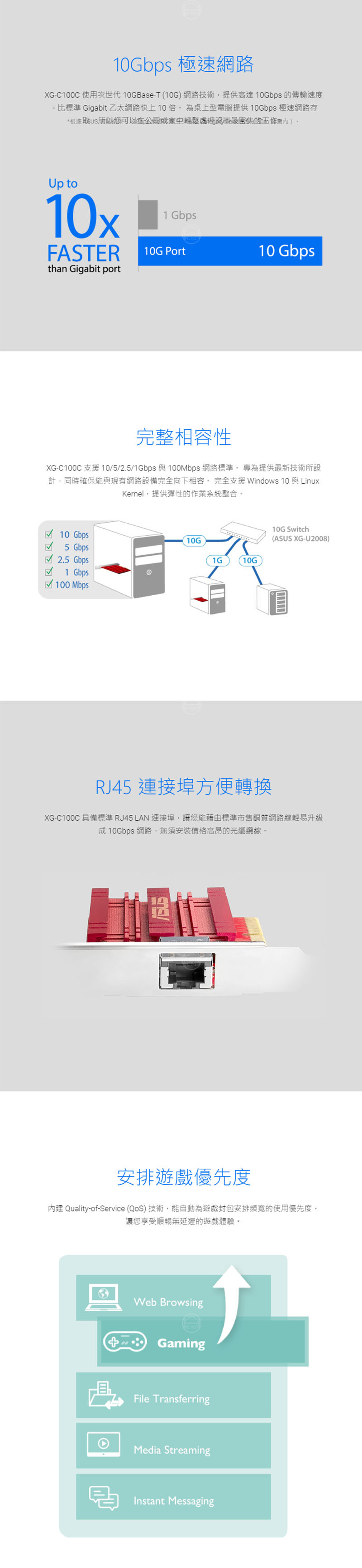 XG-C100C 支援 10/5/2.5/1Gbps 與 100Mbps 網路標準。 專為提供最新技術所設計,同時確保能與現有網路設備完全向下相容。 完全支援 Windows 10 與 Linux Kernel,提供彈性的作業系統整合。
