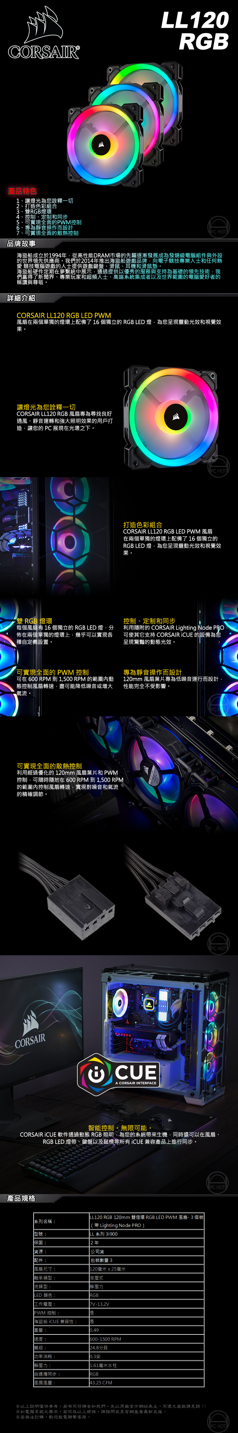 CORSAIR LL120 RGB LED PWM風扇在兩個單獨的燈環上配備了16個獨立的RGB LED燈,為您呈現靈動光效和視覺效果。