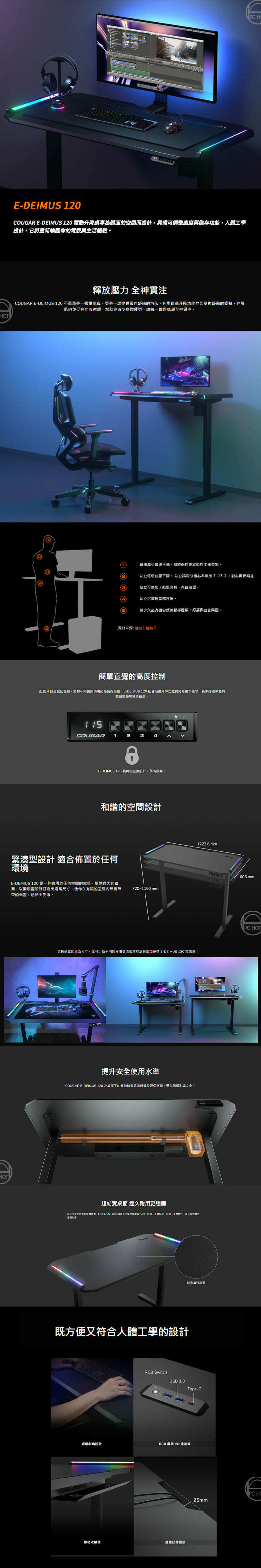 COUGAR E-DEIMUS 120 電動升降桌專為體面的空間而設計,具備可調整高度與儲存功能、人體工學設計,它將重新喚醒你的電競與生活體驗。