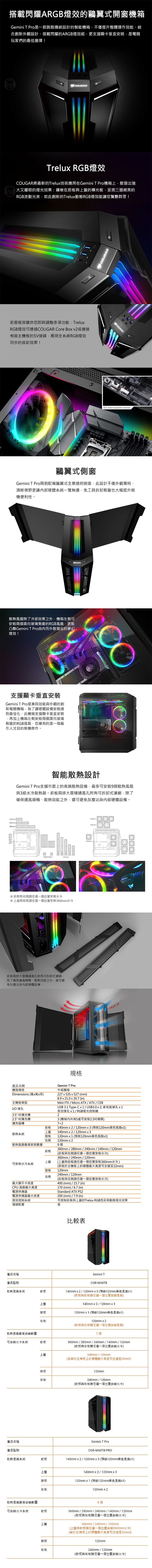Gemini T Pro是兼具效能與外觀的創新電競機箱,為了讓硬體設備安裝達到最佳化,此機箱支援顯卡垂直安裝,再加上機箱左側安裝兩個面向玻璃側窗的RGB風扇,您擁有的是一個最引人注目的裝機傑作。