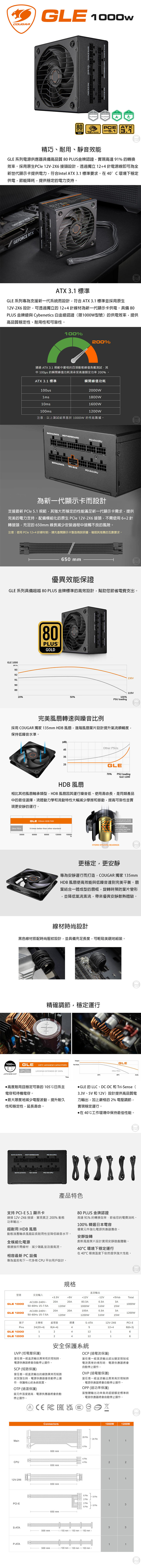 COUGAR GLE 系列專為支援新一代系統而設計,符合 ATX 3.1 標準並採用原生 12V-2X6 設計,可透過獨立的 12+4 針線材為新一代顯示卡供電。具備 80 PLUS 金牌級與 Cybenetics 白金級認證(限1000W型號)的供電效率,提供高品質穩定性、耐用性和可靠性。