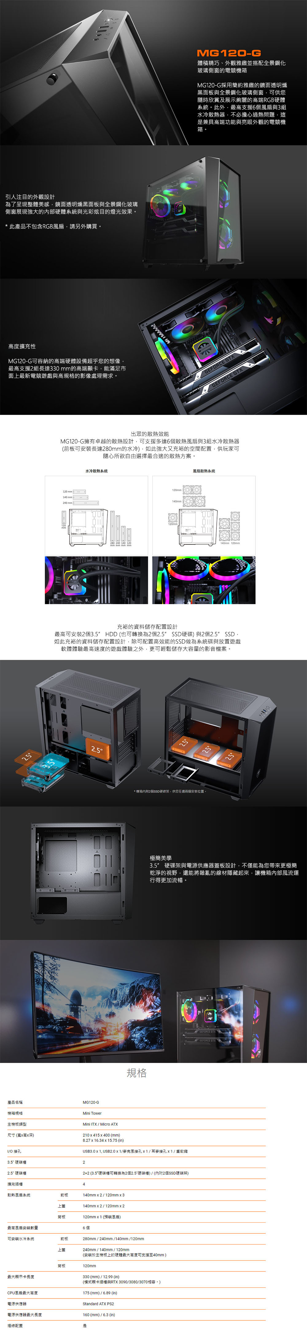 MG120-G採用簡約雅緻的鏡面透明燻黑面板與全景鋼化玻璃側窗,可供您隨時欣賞及展示絢麗的高端RGB硬體系統。此外,最高支援6個風扇與3組水冷散熱器,不必擔心過熱問題,這是兼具高端功能與亮眼外觀的電競機箱。