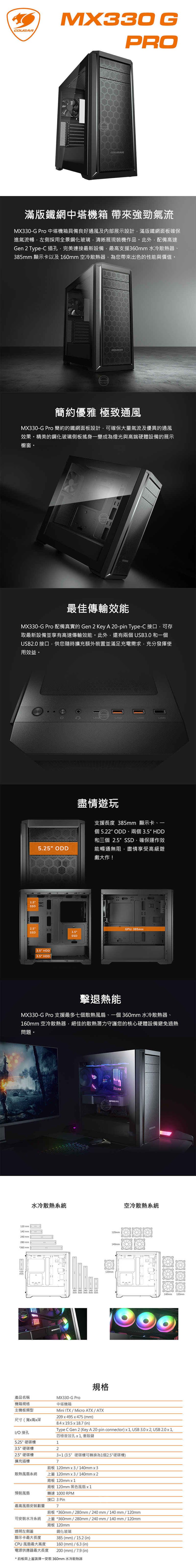 MX330-G Pro 支援最多七個散熱風扇、一個 360mm 水冷散熱器、160mm 空冷散熱器,絕佳的散熱潛力守護您的核心硬體設備避免過熱問題。
