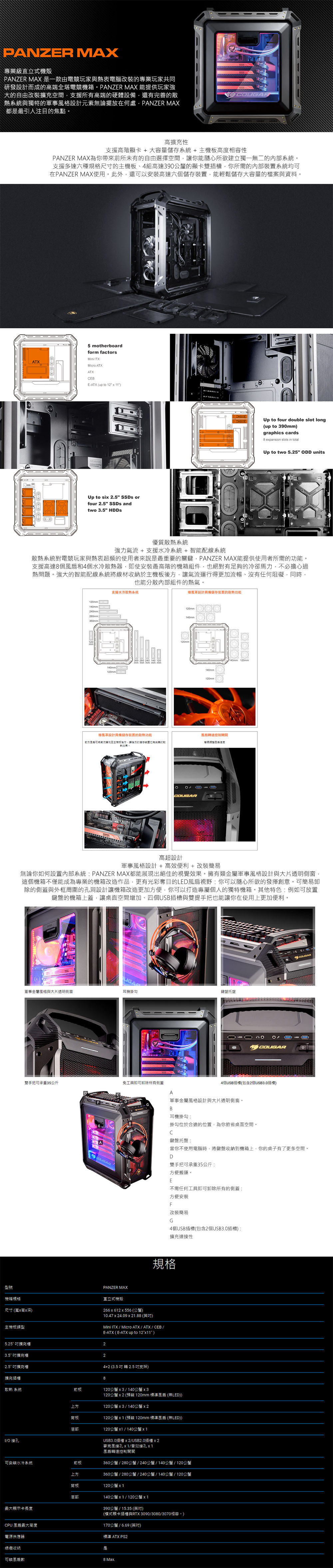 PANZER MAX 是一款由電競玩家與熱衷電腦改裝的專業玩家共同研發設計而成的高端全塔電競機箱。PANZERMAX 能提供玩家強大的自由改裝擴充空間,支援所有高端的硬體設備,還有完善的散熱系統與獨特的軍事風格設計元素無論擺放在何處,PANZERMAX 都是最引人注目的焦點。