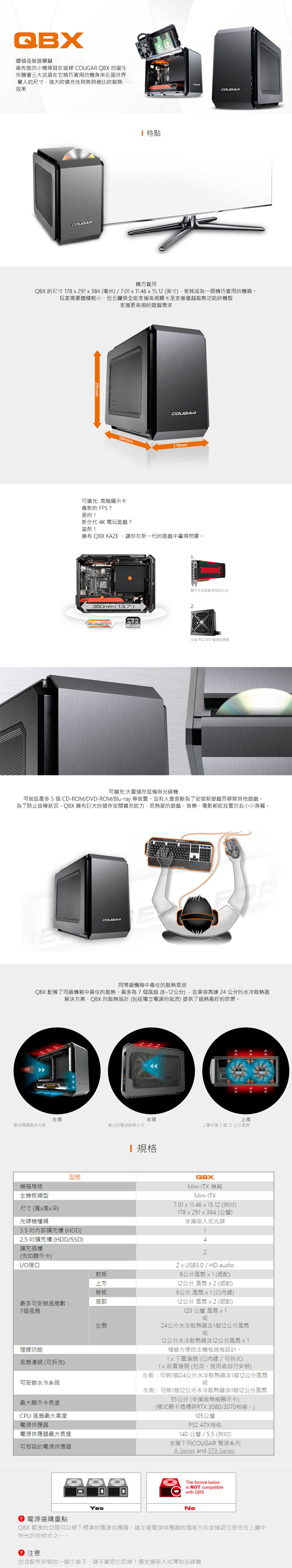 最先進的小機箱就在這裡COUGAR QBX 的誕生伴随著三大武器在它精巧實用的機身來征服世界 驚人的尺寸,強大的擴充性與無與倫比的散熱效果