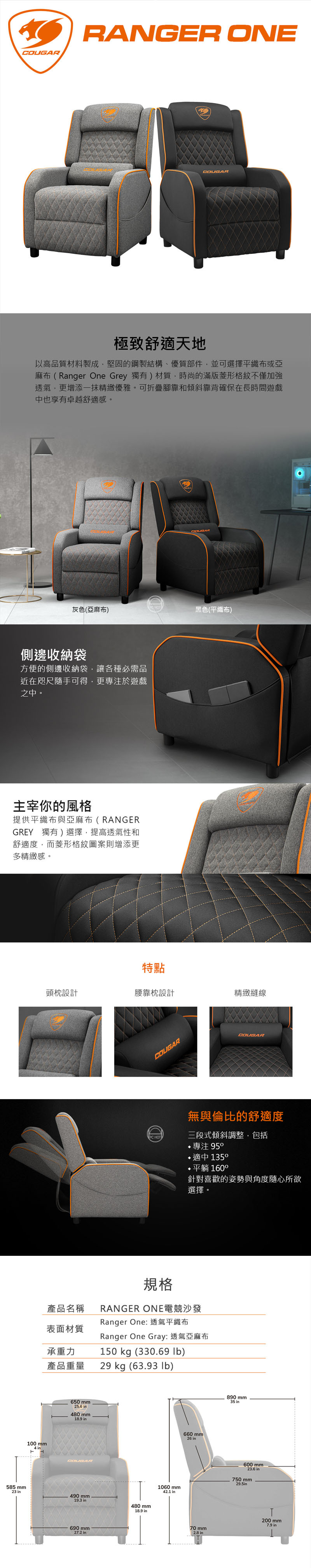 型號 COUGAR Ranger One 電競沙發/COUGAR Ranger One Gray 電競沙發