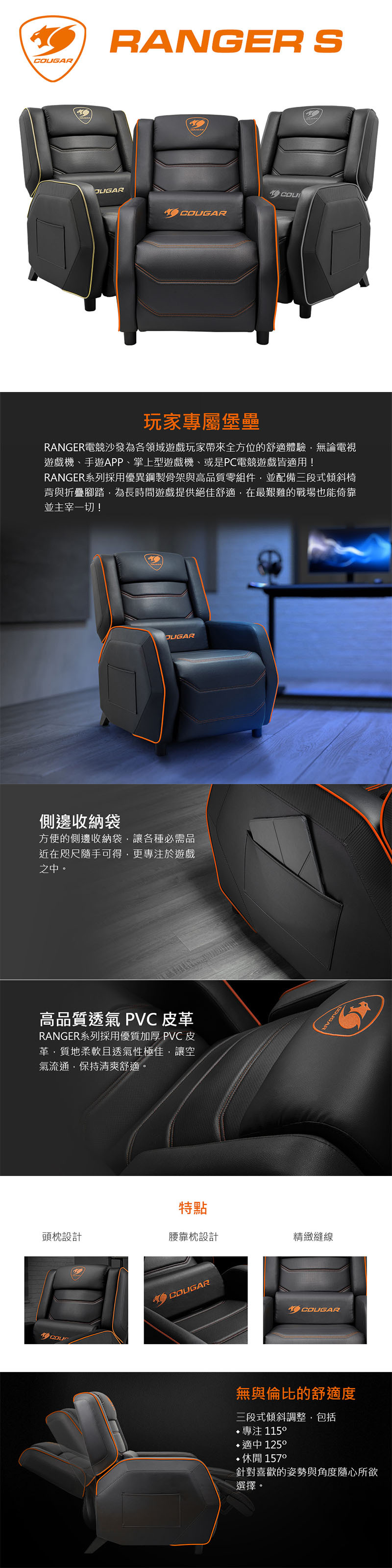 Ranger 系列採用優異鋼製骨架與高品質零組件,並配備三段式傾斜椅背與折疊腳踏,為長時間遊戲提供絕佳舒適,在最艱難的戰場也能倚靠並主宰一切!