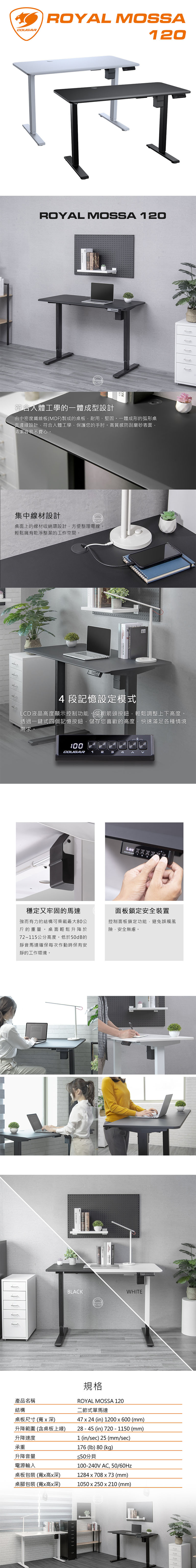 ROYAL MOSSA 120,電動升降桌,ROYAL MOSSA電動桌配備簡單易操作的高度升降控制功能。4 種記憶高度設置,可隨心所欲變換站或坐姿,減少身體疲勞。讓您擁有舒適的工作環境,創造更健康、更有效率的生活體驗。
