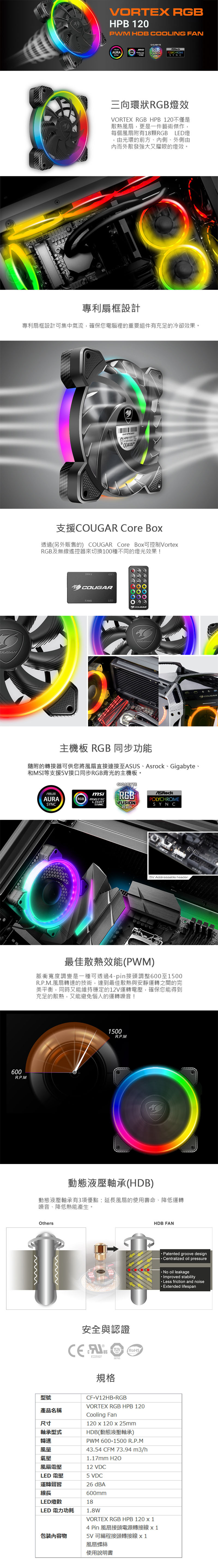 VORTEX RGB HPB 120不僅為您的機箱增添耀眼的炫彩燈效,更能有效提升整體散熱效果,加上COUGAR Core Box支援主機板5V RGB燈效同步功能,絕對是一款強大的RGB風扇,為您帶來光彩奪目的視覺效果!