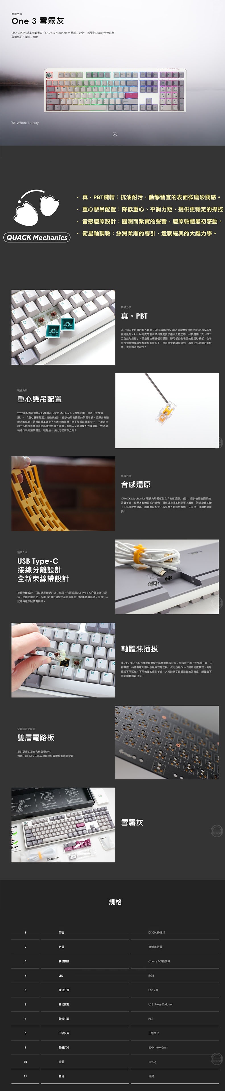 QUACK Mechanics 鴨感力學採用「真。PBT二色成形鍵帽」,當指腹接觸鍵帽的瞬間,即可感受到鍵帽表面細微的磨砂觸感,當使用者在快速移動或者頻繁敲擊的狀況下,均可踏實地掌握律動,再加上抗油耐污的特性,即便長時間使用下,DuckyOne 3系列外觀仍舊可以保持一定的視覺饗宴。
