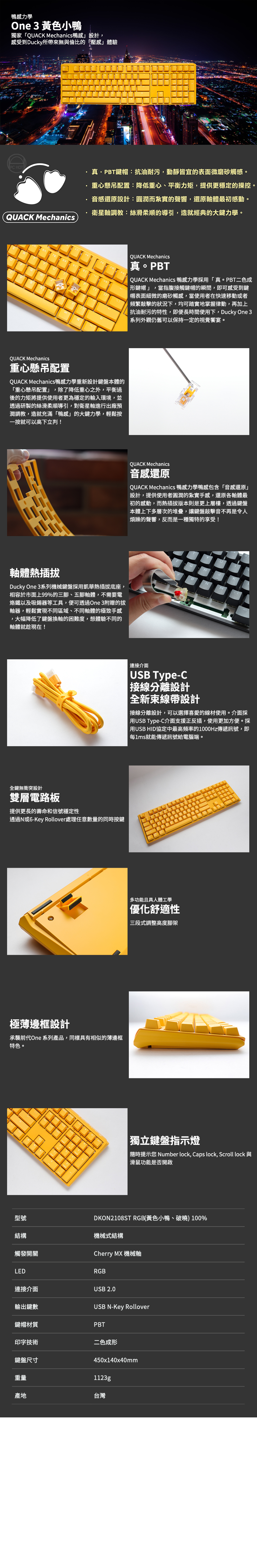 QUACK Mechanics 鴨感力學採用「真。PBT二色成形鍵帽」,當指腹接觸鍵帽的瞬間,即可感受到鍵帽表面細微的磨砂觸感,當使用者在快速移動或者頻繁敲擊的狀況下,均可踏實地掌握律動,再加上抗油耐污的特性,即便長時間使用下,Ducky One 3系列外觀仍舊可以保持一定的視覺饗宴。