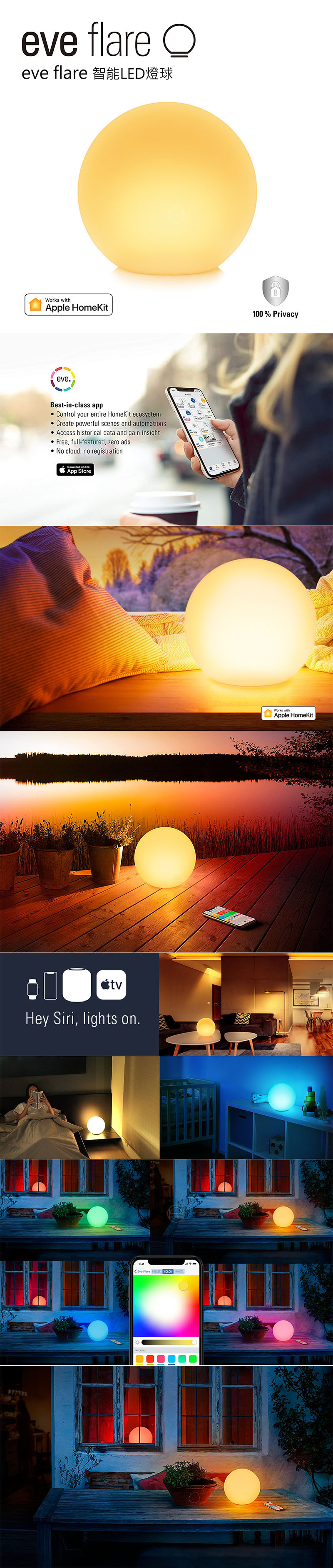 透過 Eve App,Eve Flare 可以輕鬆地與其他 Eve 系列的產品進行結合。無論是音樂、戲劇或簡單的日常照明,Eve Flare 都可透過APP或是蘋果家庭(HomeKit)調整燈光色彩及亮度。當然,你也可以使用 Eve App 來設置時間表或啟用自動場景,例如當你離開房間時,它會自動關閉,節能省電愛地球。