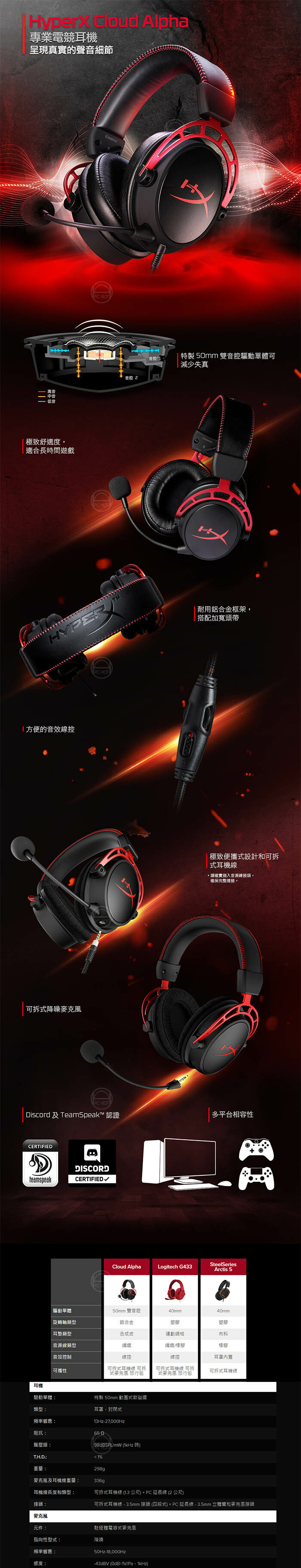 HyperX™ Cloud Alpha 突破性的雙音腔驅動單體設計可減少失真,賦予聲音更高識別度和清晰度。雙音腔可將低音與中音和高音區隔,進行最佳調音,以提供更清楚、更平順的音效。Cloud Alpha 耳機採用 HyperX 頂級紅色記憶泡棉,具獲獎肯定的舒適度,以及加寬頭帶和更柔軟的合成皮革。鋁合金框架持久耐用,並且應玩家要求,Cloud Alpha 配備了堅韌的可拆式編織音源線。可拆式降噪麥克風獲得 Discord 及 TeamSpeak� 的認證,確保絕佳的團隊溝通品質。其音效線控與多平台相容,不管是在 PC、PS4�、Xbox One™ 還是其他配備 3.5mm 連接埠的平台,所有重度玩家都能享受 Cloud Alpha 創新的絕佳音效。
