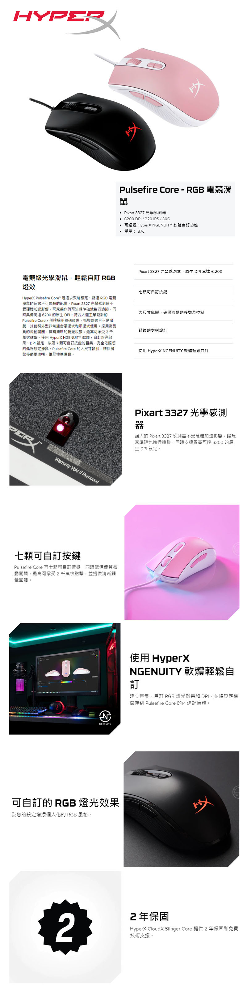 HyperX Pulsefire Core™ 是追求強大、舒適、有線 RGB 電競滑鼠的玩家不可或缺的配備。Pixart 3327 光學感測器不受硬體加速影響,讓玩家流暢準確地進行追蹤,同時具備高達 6200 的原生 DPI。符合人體工學設計的 Pulsefire Core 的側邊設計採用特殊紋理,抓握舒適且不易滑脫,而其對稱外型非常適合掌握式和爪握式使用。配備優質微動開關,最高可承受 2 千萬次鍵擊,並帶來清晰觸覺反饋。利用 HyperX NGenuity 軟體,自訂燈光效果、DPI 設定,以及 7 顆可自訂按鍵的巨集,如您所願設定您專屬的滑鼠。Pulsefire Core 的大尺寸鼠腳,確保滑鼠移動更流暢,讓您神準爆頭。
