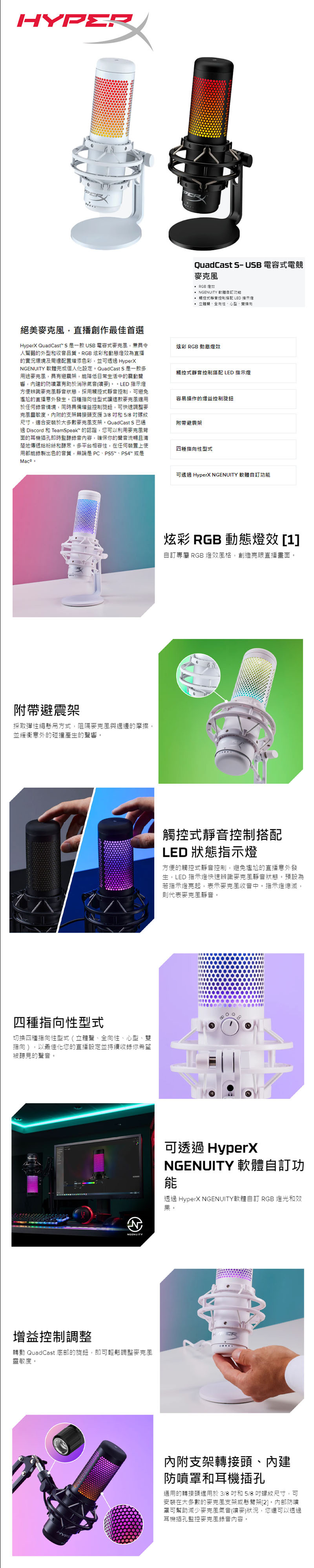 HyperX QuadCast™ S 是一款 USB 電容式麥克風,兼具令人驚豔的外型和收音品質。RGB 炫彩和動態燈效為直播的實況環境及周邊配置增添色彩,並可透過 HyperX NGENUITY 軟體完成個人化設定。QuadCast S 是一款多用途麥克風,具有避震架,能降低日常生活中的震動聲響,內建的防噴罩有助於消除氣音(噴麥)。。LED 指示燈方便辨識麥克風靜音狀態,採用觸控式靜音控制,可避免尷尬的直播意外發生。四種指向性型式讓這款麥克風適用於任何錄音情境,同時具備增益控制旋鈕,可快速調整麥克風靈敏度。內附的支架轉接頭支援 3/8 吋和 5/8 吋螺紋尺寸,適合安裝於大多數麥克風支架。QuadCast S 已通過 Discord 和 TeamSpeak™ 的認證,您可以利用麥克風背面的耳機插孔即時監聽錄音內容,確保你的聲音流暢且清楚地傳遞給粉絲和聽眾。多平台相容性,在任何裝置上使用都能錄製出色的音質,無論是 PC、PS5™、PS4™ 或是 Mac®。