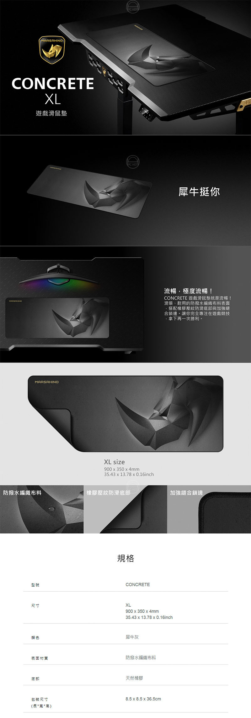 CONCRETE 遊戲滑鼠墊就是流暢!滑順、耐用的防撥水編織布料表面,搭配橡膠壓紋防滑底部與加強縫合鎖邊。讓你完全專注在遊戲競技,拿下再一次勝利。