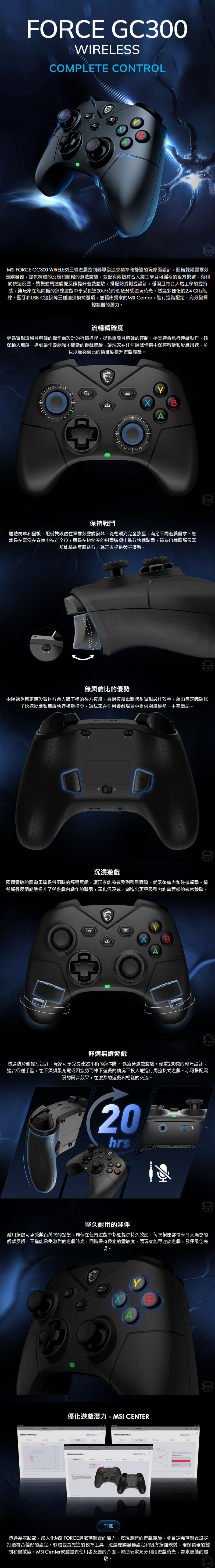 MSI FORCE GC300 WIRELESS三模遊戲控制器專為追求精準和舒適的玩家而設計,配備雙段霍爾效應觸發器,提供精確的反應和順暢的遊戲體驗,並配有兩個符合人體工學且可編程的後方按鍵,有利於快速反應。雙振動馬達觸覺反饋提升遊戲體驗,搭配防滑側握設計,穩固且符合人體工學的握持感,讓玩家在無間斷的無線遊戲中享受長達20小時的低疲勞感遊玩時光。透過多樣化的2.4 GHz無線、藍牙和USB-C連接等三種連接模式選項,並藉由獨家的MSI Center,進行進階配定,充分發揮控制器的潛力。