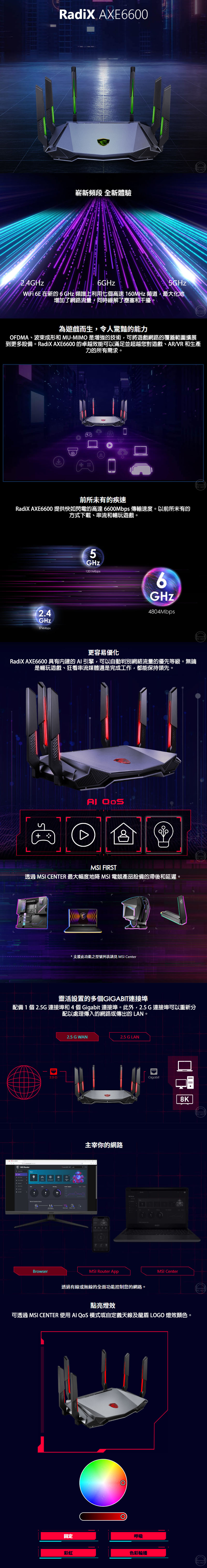 1. 新的6 GHz頻段:在最新的6 GHz頻段上玩遊戲,享受不受干擾的WiFi,三頻傳輸速度高達6600 Mbps。