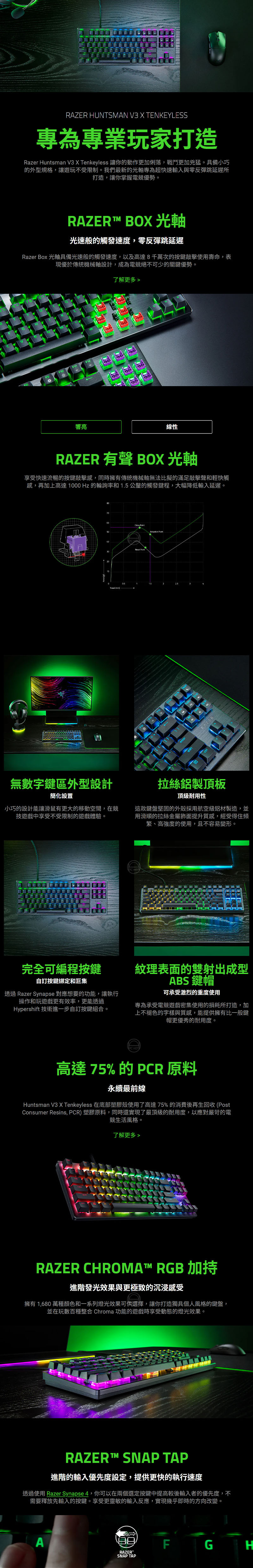 Huntsman V3 X Tenkeyless 在底部塑膠殼使用了高達 75% 的消費後再生回收 (Post Consumer Resins, PCR) 塑膠原料,同時還實現了最頂級的耐用度,以應對嚴苛的電競生活風格。