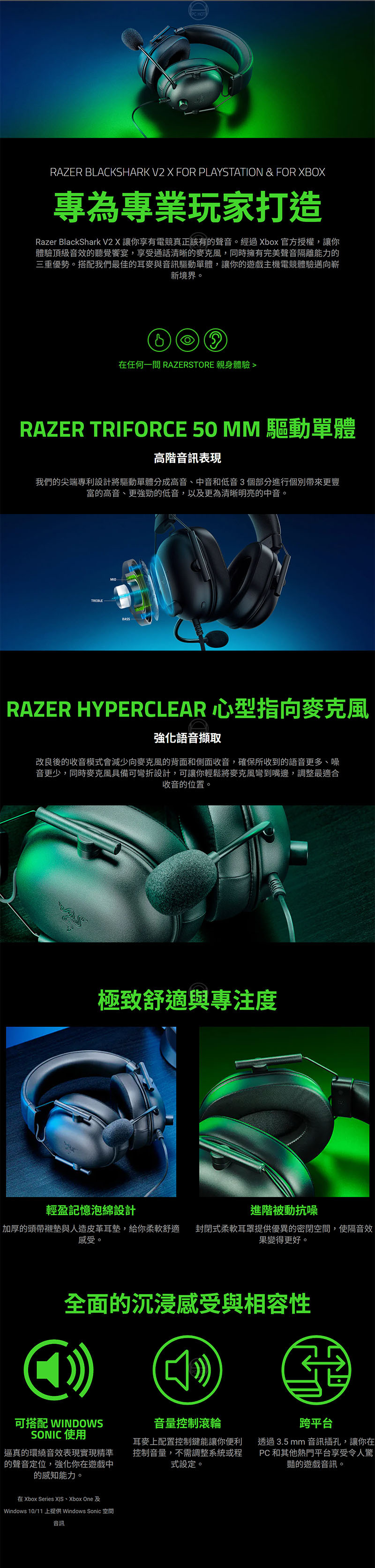 Razer BlackShark V2 X 讓你享有電競真正該有的聲音。經過 Xbox 官方授權,讓你體驗頂級音效的聽覺饗宴,享受通話清晰的麥克風,同時擁有完美聲音隔離能力的三重優勢。搭配我們最佳的耳麥與音訊驅動單體,讓你的遊戲主機電競體驗邁向嶄新境界。