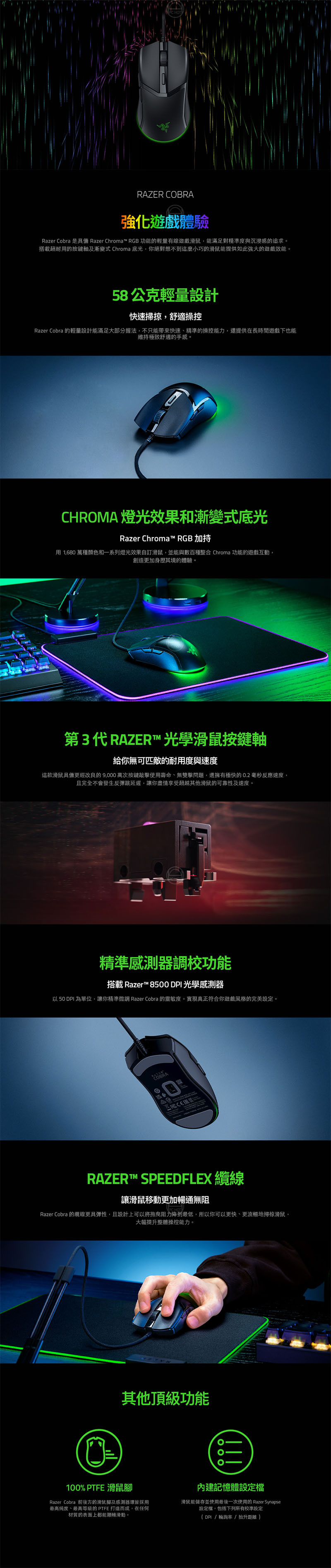 Razer Cobra 是具備 Razer Chroma RGB 功能的輕量有線遊戲滑鼠,能滿足對精準度與沉浸感的追求。搭載超耐用的按鍵軸及漸變式 Chroma 底光,你絕對想不到這麼小巧的滑鼠能提供如此強大的遊戲效能。