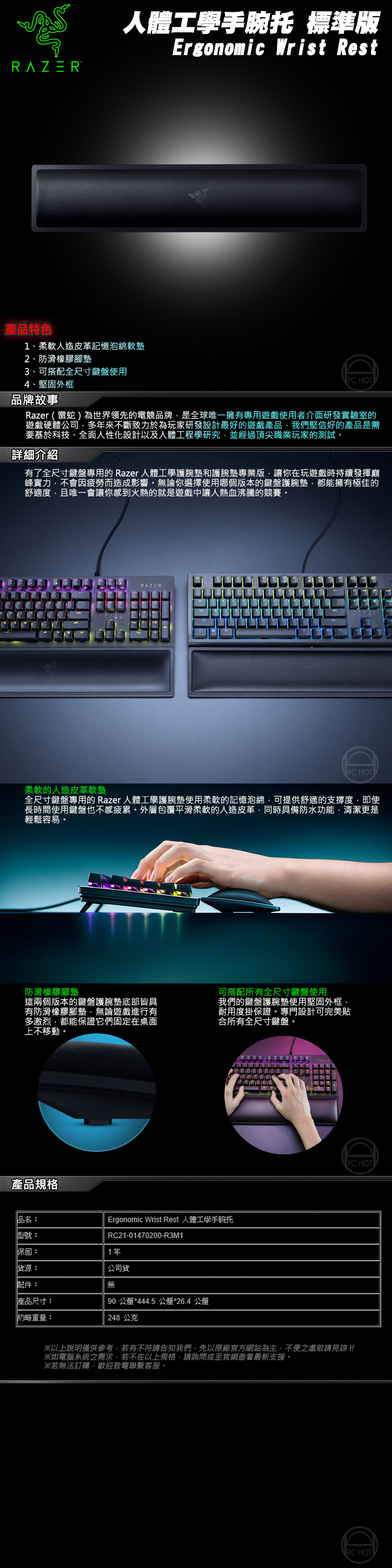 Razer(雷蛇)為世界領先的電競品牌,是全球唯一擁有專用遊戲使用者介面研發實驗室的遊戲硬體公司,多年來不斷致力於為玩家研發設計最好的遊戲產品,我們堅信好的產品是需要基於科技、全面人性化設計以及人體工程學研究,並經過頂尖職業玩家的測試。