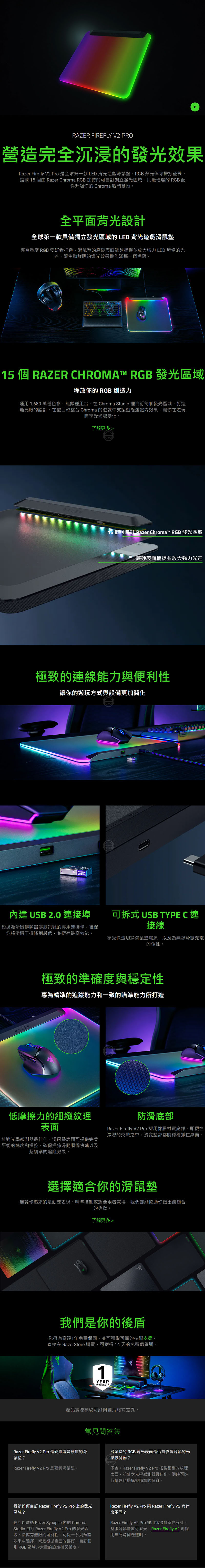 Razer Firefly V2 Pro 是全球第一款 LED 背光遊戲滑鼠墊,RGB 榮光伴你掃掠征戰。搭載 15 個由 Razer Chroma RGB 加持的可自訂獨立發光區域,用最璀璨的 RGB 配件升級你的 Chroma 戰鬥基地。