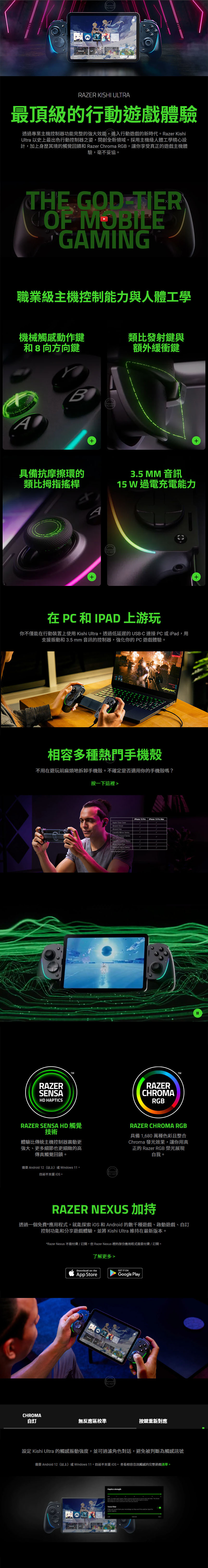 透過專業主機控制器功能完整的強大效能,進入行動遊戲的新時代。Razer Kishi Ultra 以史上最出色行動控制器之姿,開創全新領域。採用主機級人體工學精心設計,加上身歷其境的觸覺回饋和 Razer Chroma RGB,讓你享受真正的遊戲主機體驗,毫不妥協。