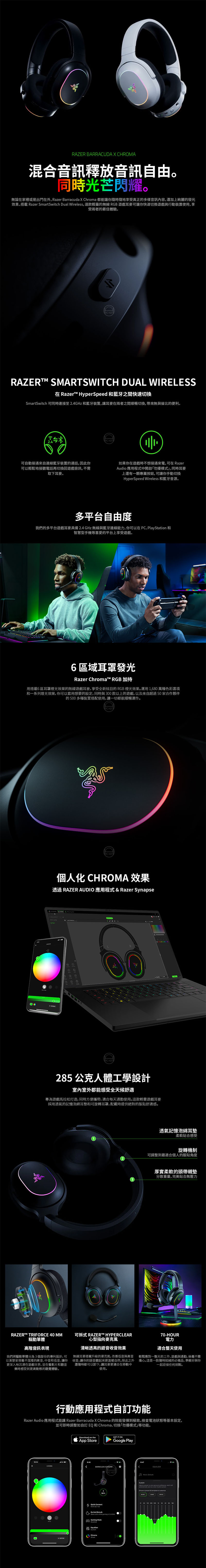 無論在家裡或是出門在外,Razer Barracuda X Chroma 都能讓你隨時隨地享受真正的多樣音訊內容,還加上絢麗的發光效果。搭載 Razer SmartSwitch Dual Wireless,這款輕量的無線 RGB 遊戲耳麥可讓你快速切換遊戲與行動裝置使用,享受兩者的最佳體驗。