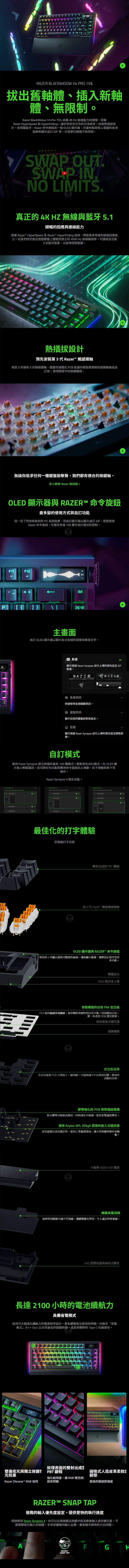 搭載 Razer™ HyperSpeed 及 Razer™ HyperPolling 技術,釋放更高等級的遊戲回應能力。玩家們終於能在遊戲鍵盤上體驗到真正的 4000 Hz 無線輪詢率。可連線及切換 3 台藍牙裝置,以延伸控制範圍。