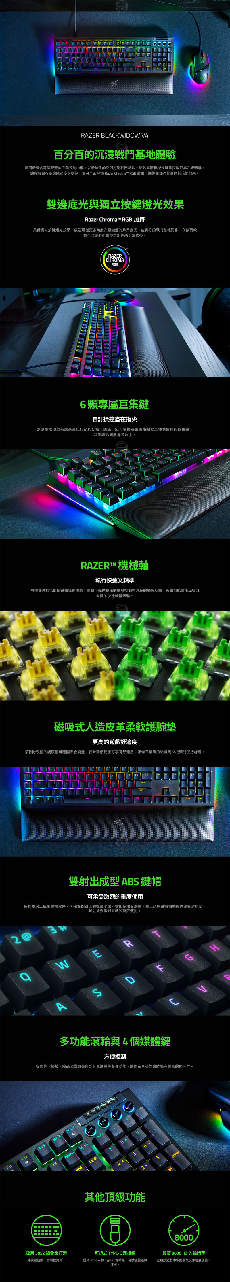 運用最適合電腦配置的完美控制中樞,以最佳化的空間打造戰鬥基地。這款高階機械式鍵盤搭載巨集和媒體鍵,讓你輕鬆存取進階命令與捷徑,更可全面發揮 Razer Chroma™ RGB 效果,讓你更加強化身歷其境的效果。