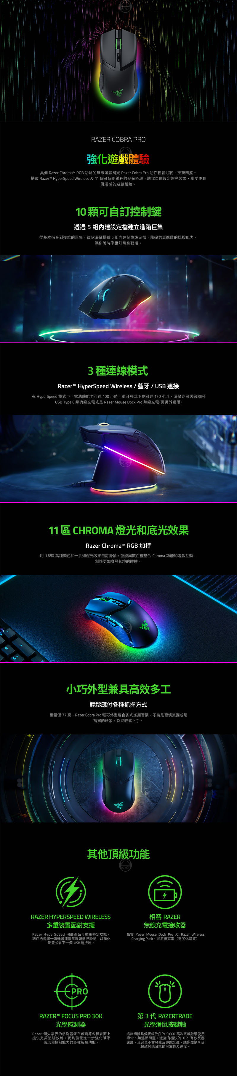 具備 Razer Chroma RGB 功能的無線遊戲滑鼠 Razer Cobra Pro 助你輕鬆迎戰,技驚四座。搭載 Razer HyperSpeed Wireless 及 11 個可個別編程的發光區域,讓你自由設定燈光效果,享受更具沉浸感的遊戲體驗。