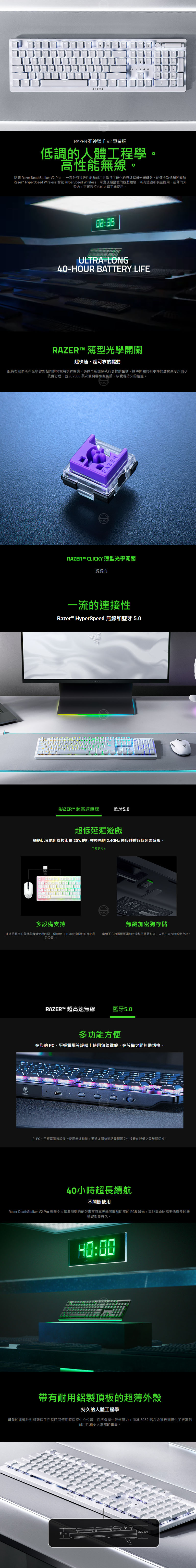 認識 Razer DeathStalker V2 Pro——一款針對頂級性能和耐用性進行了優化的無線超薄光學鍵盤。配備全新低調開關和 Razer™ HyperSpeed Wireless 雷蛇 HyperSpeed Wireless,可實現超靈敏的遊戲體驗,所有這些都裝在耐用、超薄的外殼內,可實現持久的人體工學使用。