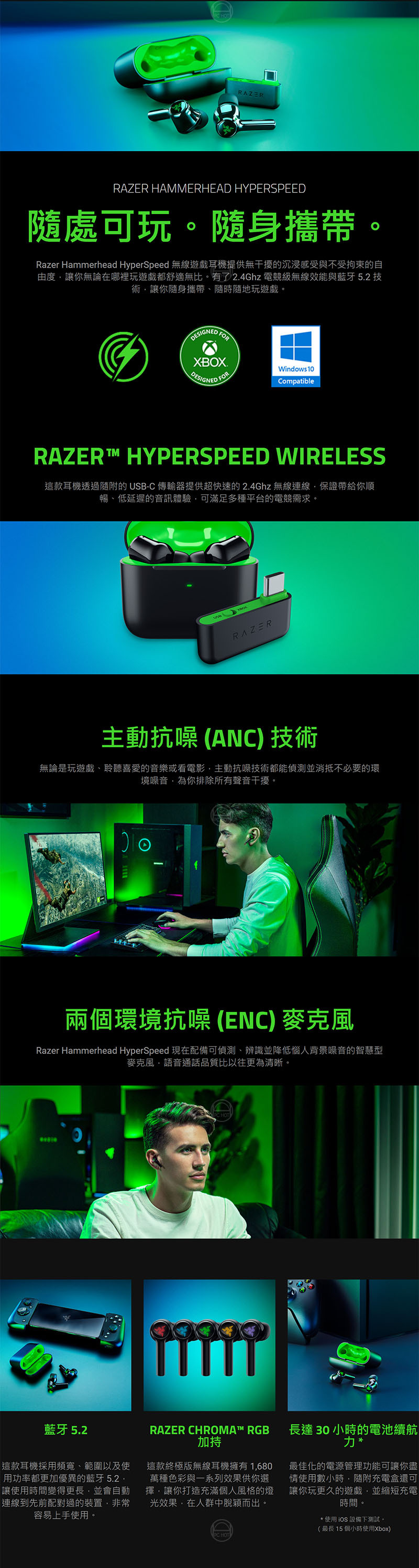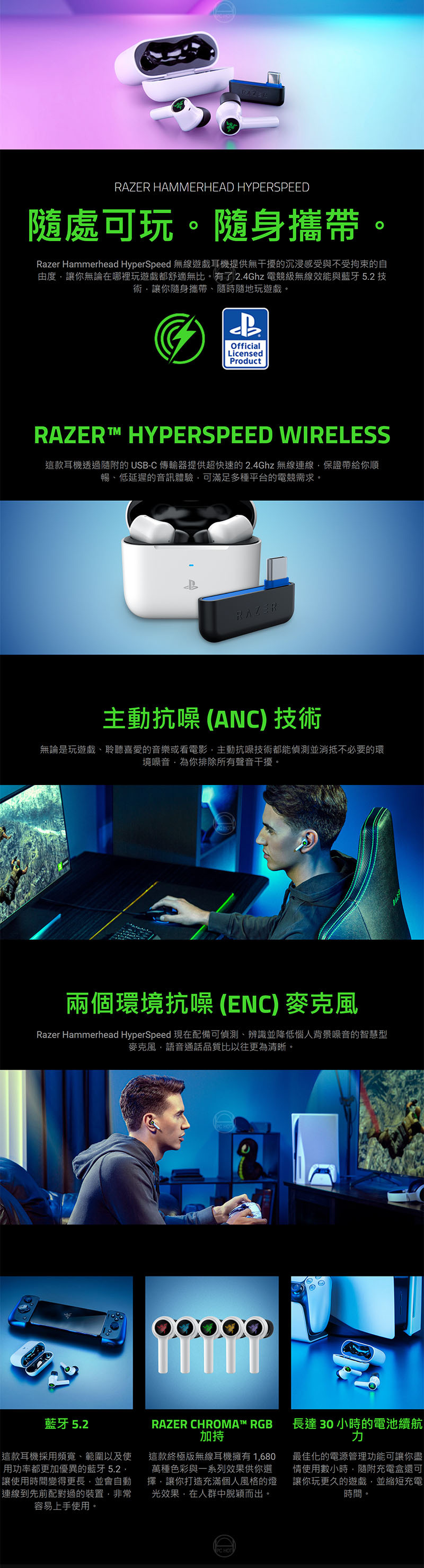 Razer Hammerhead HyperSpeed 無線遊戲耳機提供無干擾的沉浸感受與不受拘束的自由度,讓你無論在哪裡玩遊戲都舒適無比。有了 2.4Ghz 電競級無線效能與藍牙 5.2 技術,讓你隨身攜帶、隨時隨地玩遊戲。